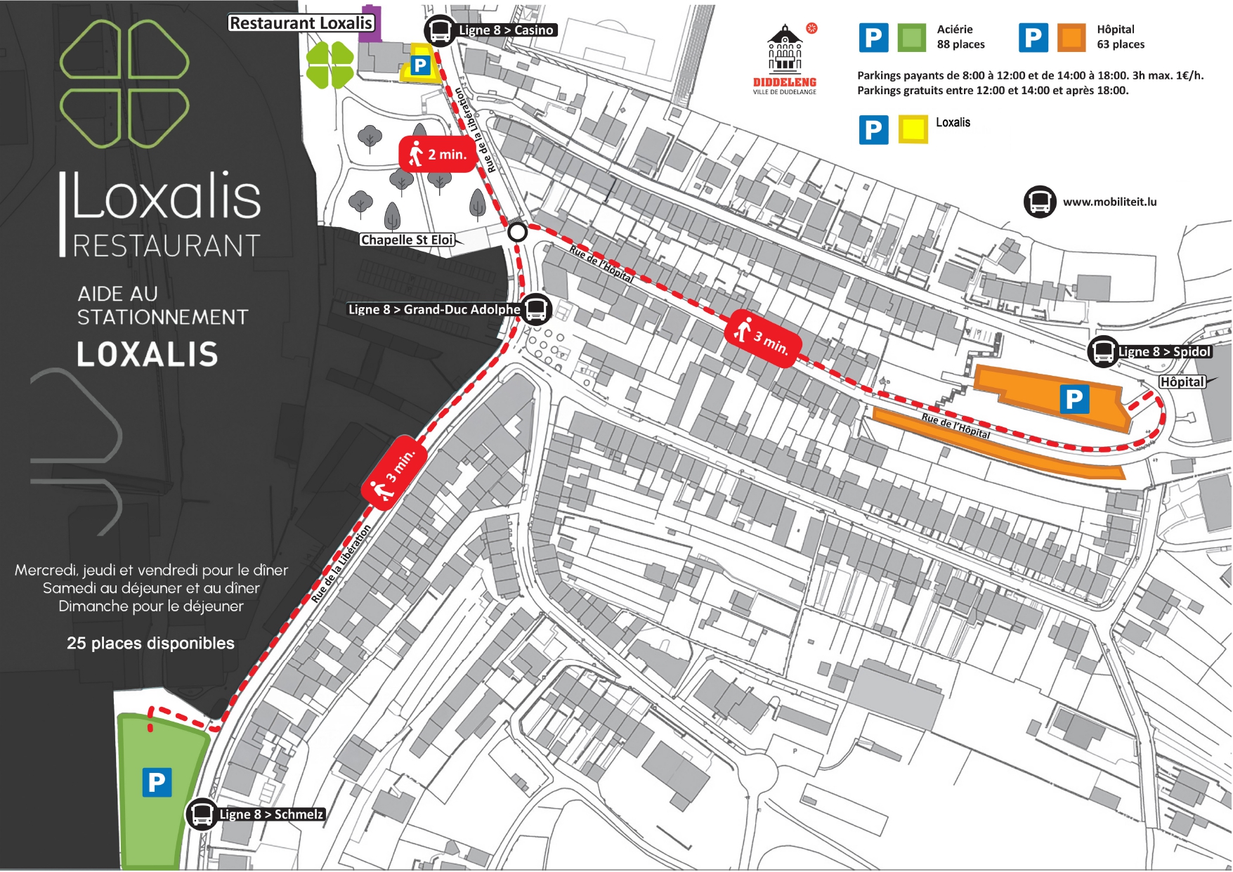 Le Restaurant Loxalis, situé au Casino Dudelange, met tout en œuvre pour rendre vos visites plus agréables avec son aide au stationnement. Profitez de 25 places disponibles les mercredis, jeudis, vendredis pour le dîner, samedis pour le déjeuner et le dîner, ainsi que dimanches pour le déjeuner.