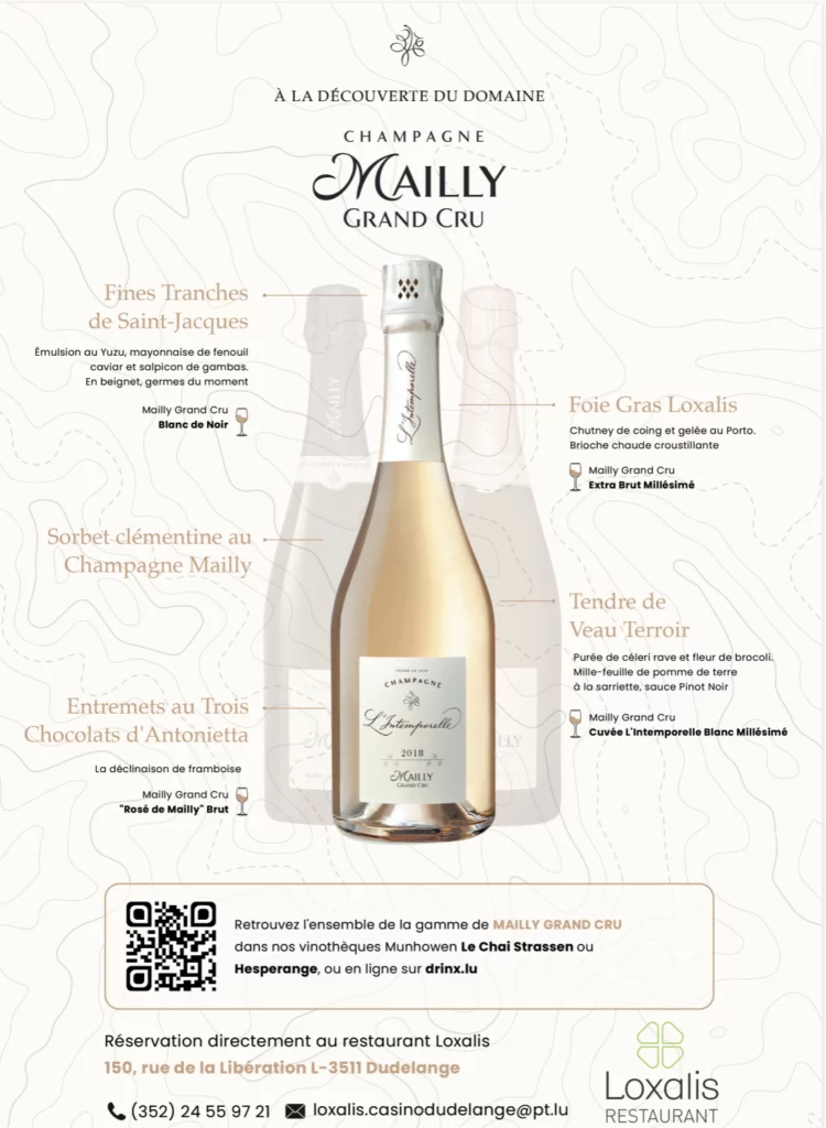 Le jeudi 11 décembre 2025 à 19h00, le restaurant Loxalis (Casino 2000 – Mondorf-les-Bains) vous invite à une soirée exceptionnelle dédiée au prestigieux Champagne Mailly Grand Cru.
